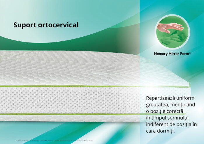 - Sprijin deosebit pentru cap și gât: Acest lucru se datoreaza spumei Green Therm Memory HD, care se adaptează perfect formei capului, gâtului și umerilor pentru o aliniere corporală naturală.